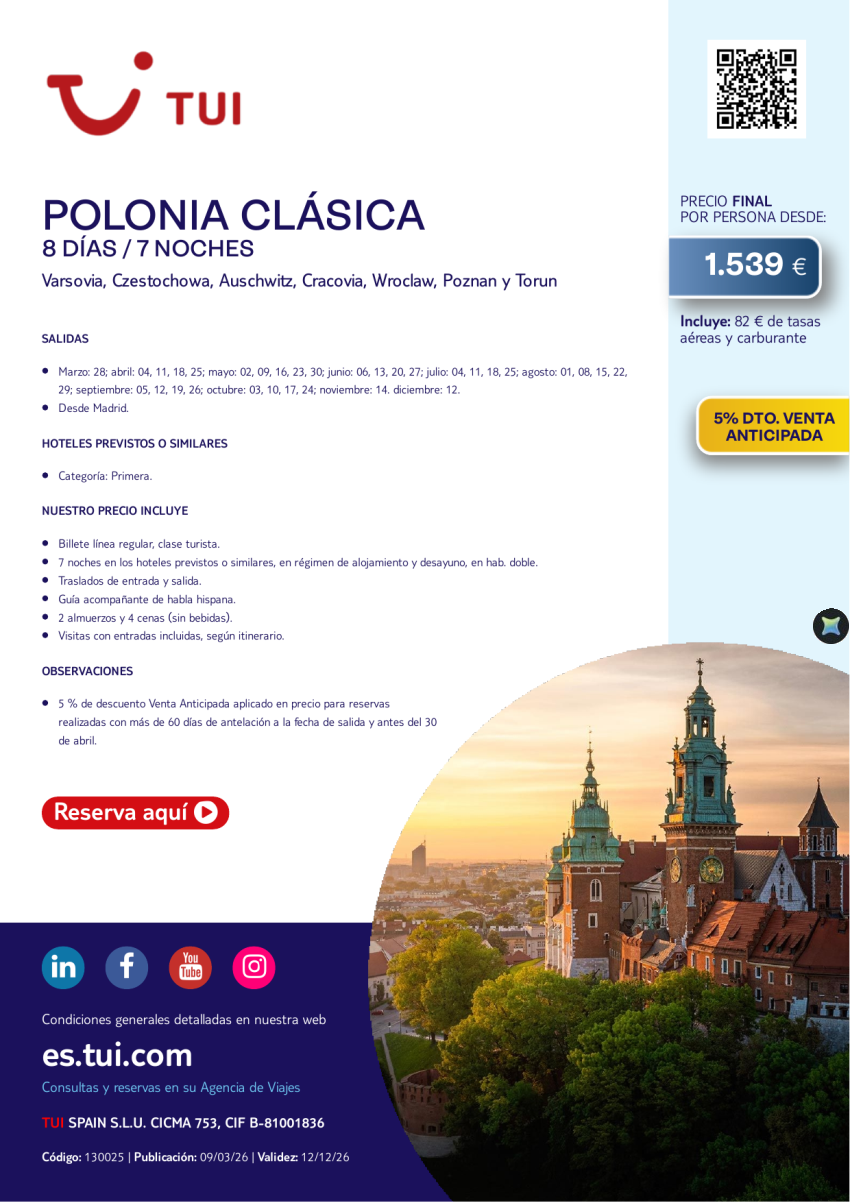 Polonia Clásica. 8 días / 7 noches. 5% Dto VA. Salidas desde MAD desde 1.539 €